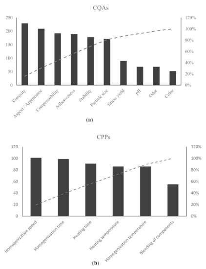 Based on the REM results, two Pareto charts were generated (Figure 3a,b). The Pareto chart illustrates the severity scores and demonstrates the CQAs and CPPs that had values higher than 100. Based on the results of the risk assessment, viscosity and aspect were classified as highly critical factors for CQAs. In contrast, odor and color are the least critical issues. In addition, according to Figure 3b, homogenization speed and homogenization time are highly critical factors for CQAs. Pareto charts also prioritize the critical attributes that should be more controlled and investigated in this study.