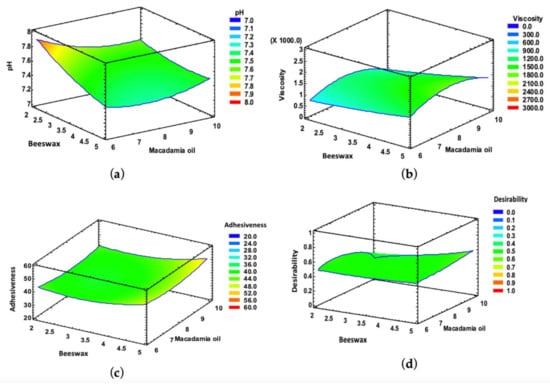 Figure 4a shows the graph obtained for the Y1 (pH) response, illustrating the relationship between the pH value, the concentration of two factors (amount of beeswax (X2) and macadamia oil (X3)) and the amount of surfactant (X1) fixed at the medium level (1.0). According to the obtained result, at the lowest X2 level, the pH value decreased when the amount of X3 increased from 6 to 10. On the other hand, at the highest level of X2, the pH value did not change significantly.