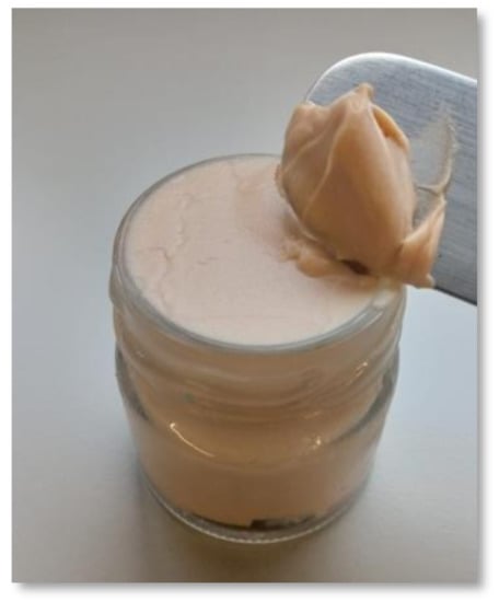 Organoleptic analysis demonstrated that the formulation presented a homogeneous aspect, without phase separation, and the consistency was considered adequate, as shown in Figure 5. A light brown and fruity odor like caramel was also observed.