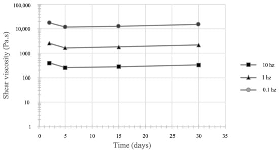 The rheological tests were performed on the optimal formulation with the aim of analyzing the behavior when subjected to a certain tension, evaluating the force applied when the product is spread on the skin. Furthermore, the viscosity was screened. The assessment of viscosity over time is a significant parameter for estimating the product’s stability []. The values obtained were between 2618 Pa.s and 2205 Pa.s. As shown in Figure 6, a small viscosity reduction was observed until a certain period, which was probably related to internal structure modifications. Nevertheless, this decrease is not significant, as it stabalized after 5 days.