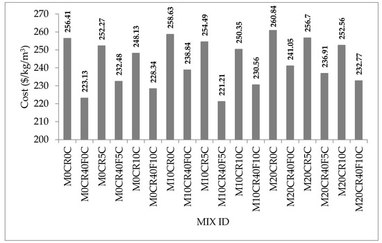 The cost of the material used in this study was obtained from the market prices and is shown in Table 3. The total cost for each of the mix was calculated using Equation (1).