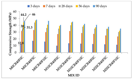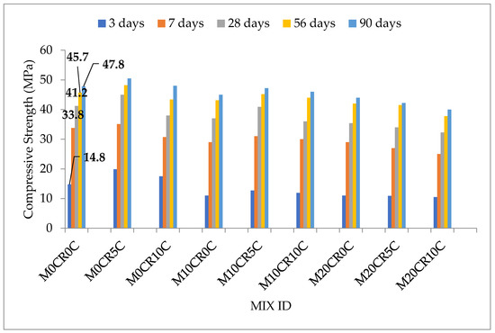 From Figure 4, it can be observed that mixes containing CCR such as M0CR5C and M0CR10C demonstrated higher early strength development at 3 days compared to mixes without CCR such as M0CR0C. This can be attributed to the higher CaO (cementitious element) content of CCR, which is a major compound also found in cement, reacting during the early hydration process to produce the compound for strength development in the concrete. As CCR is a highly reactive pozzolanica material, the pozzolanic reaction occurs at earlier ages, thereby enhancing the early strength development