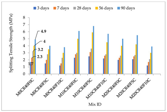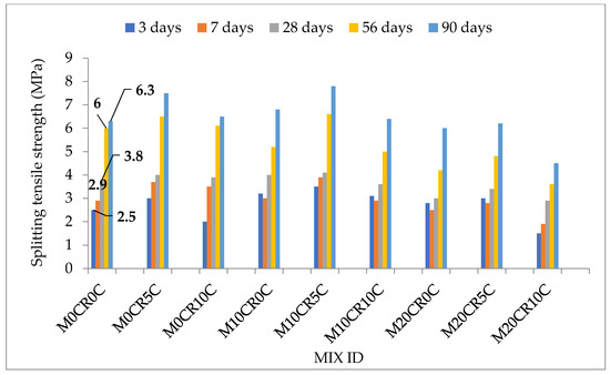 The results of the splitting tensile strength of various SCC mixes without and with optimum 40% fly ash is presented in Figure 6 and Figure 7. The splitting tensile strength of all the mixes increased with curing age and decreased on adding the optimum 40% fly ash content to the mix. The 28 days splitting tensile strength of the SCC mix without FA ranged from 2.9 to 4.1 N/mm2 but decreased to the range of 2.1 to 3.6 N/mm2 on replacement of 40% of cement with fly ash. Generally, increment in splitting tensile strength was observed on incorporating CR and CCR into the mix but decreased beyond 10% CR and 5% CCR, though not below that of the control mix. Hence, mix M10CR5C and M10CR40F5C had the maximum splitting tensile strength value for without and with fly ash mixes, respectively. The increase in the splitting tensile strength of concrete resulted from the increased micro fiber nature of CR, which bridges the cracks in the concrete, thereby reducing the chance of total failure [33]. However, the decrease in the splitting tensile strength when the proportion of CR is further increased is based on the weak bonding between harden concrete paste matrix and rubber particles, which results in small cracks and consequently sudden strength loss [37]. The presence of CCR enhanced the splitting tensile strength. For example, the splitting tensile strength of mix M10CR0C containing 10% CR and 0% CCR was increased by 2.4% on incorporation of 5% CCR on mix M10CR5C. This increment is caused by a large surface area and the irregular morphology of CCR particles which enhanced the bond between the hardened cement paste and aggregates [38]. This is similar to the finding of Bayuaji et al. [39].