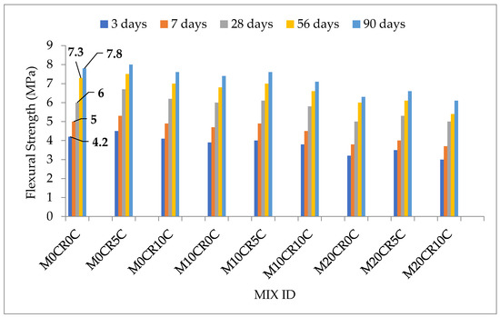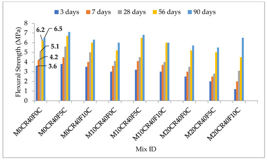 The results of flexural strength of various SCC blends without and with optimum 40% fly ash are presented in Figure 8 and Figure 9, respectively. The highest 28-day flexural strength of 6.7 MPa without fly ash was achieved with mix M0CR5C in proportions of 0% and 5% of CR and CCR, respectively. Mix M20CR0C has the lowest flexural strength of 4.9 MPa with a mixed proportion of CR and CCR at 20% and 0%, respectively. The increase in flexural strength associated with the incorporation of CCR was due to the increased pozzolanic reaction resulting from the strengthening of the interfacial zone between CR-cement paste and aggregate. The average flexural strength of SCC ranges from 3 to 6 MPa; as such, the flexural strength of all the mixes falls within this range with the maximum exceeding it. This implies that partial replacement of cementitious materials with CCR in the right proportion will result in an SCC of quality flexural strength. The results of the mix containing fly ash in Figure 9 followed the same trend. Overall, this is in line with the result obtained from the research conducted by Ganesan et al. [40]. The increse in flexural strength due to CR addition can be attributed to the higher flexibility, bending ability and fibrous nature of the CR in comparison to fine aggregate it partially replaced. This resulted to an improvement in post-cracking bending resistance, giving the SCC some capability of resisting some bending loading, even after failure [33].