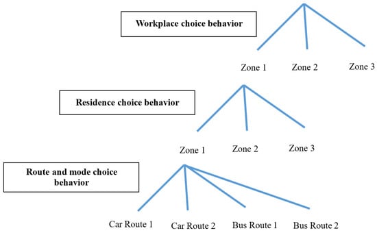 - A1: Each user first chooses a workplace, then residence place and then route or mode choice is made. Before starting a journey, each user chooses a travel strategy (i.e., private car or public bus), depending upon minimum travel costs. Figure 1 shows the workers’ choice structure.