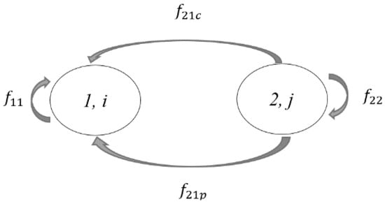 The model has quite a good number of variables. However, in this study we tried to explain the model with the help of a simple example for the sake of improving the understanding. In this study, two transport modes (private car and public bus) are considered in the transit network between two Zones i and j, as traffic assignment model. It is considered that people choose to live in Zone j and they work in Zone i. Zone i is a Central Business District (CBD) and Zone j is a suburb. The travelers have two options for traveling—i.e., private car and public bus—they will always choose an option with minimum traveling costs. The traffic flow by private car is represented as , while the traffic flow by public bus is represented as (Figure 2). In addition to this, the cost of traveling by private car includes the travel time (traveling costs and maintenance cost), fuel cost, and the parking cost. The travel cost by public bus includes the travel cost, waiting time cost, and fare. The waiting time in the formulation of travel cost by public bus is done to increase the realism of the transit network. The simulation results are coded in MATLAB version 2018a and run-on personal computer Intel(R) Core™ i5-4590 CPU 3.30 GHz, 16 GB RAM, and Windows 10 Education with 64-bit Operating System. A simple example of the sample transit network to explain the model is shown in Figure 2.