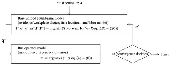 Assuming that the conditions for public transportation are given; where represent the bus frequency (number of vehicles on route) and represents the bus fare. The unified equilibrium model (including transportation network, firm location, residential/workplace location decision, and land/labor market) can be formulated as the following optimization problem.