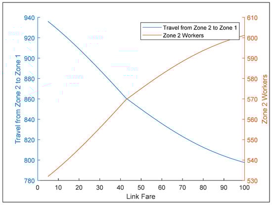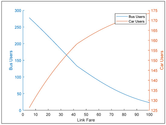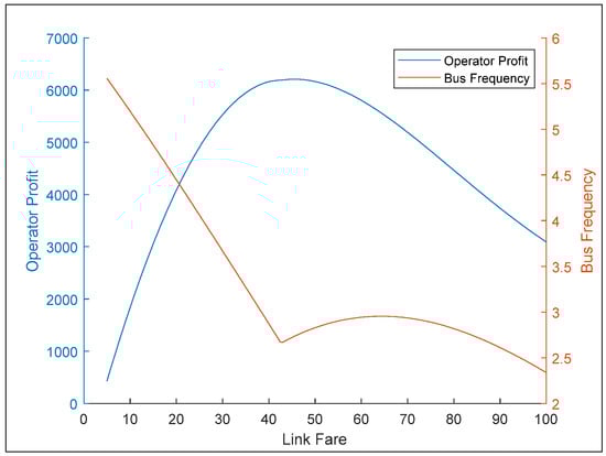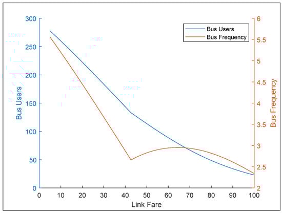 The relationship between link fare, bus users, and bus frequency are formulated in Figure 5. The change in bus frequency and bus users was observed against a range of link fare from 5 to 100 currencies. The bus frequency is formulated endogenously for achieving the strategic targets of attracting more commuters towards public bus while maximizing the profit of the bus operator. This bus frequency calculated from the bus operator model is incorporated into the unified equilibrium model to determine the costs of travel using specific mode (public bus or private car) on specific route. The user’s profit is calculated in terms of their traveling costs (measured in monetary units) between Zone 2 and 1. It can be seen from Figure 5 that increasing link fare increases the travel cost, which results in a decrease of public bus users. However, on the other hand, when link fare is lower, a greater number of commuters tend to use public bus because of lower traveling costs while using public bus; therefore, the bus frequency is more to accommodate the demand of traveling. In this situation where the link fare is small, the frequency is mostly determined by the constraint Equation (25). In other words, the bus company operates only the minimum number of buses necessary for its capacity. Figure 5 shows that when the link fare is 42.5 currencies, the bus frequency is 2.671, which shows that—for the range of fare between 30 to 55—the bus operator tries to operate at a lower frequency than in the case where a higher or lower fare is set. However, when the link fare is 65, then the bus frequency is locally maximum to accommodate the corresponding demand of traveling from Zone 2 to Zone 1. These findings also confirm similar results reported by []. However, if the link fare is further increased, the bus frequency keeps on decreasing which confirms that there is less demand of traveling between Zone 2 to Zone 1. In other words, the use of public bus would be further decreased if bus fare is increased. These results indicated that if the fares for bus services are not set appropriately, the service frequency may become extremely low, deteriorating the service quality of public transport.