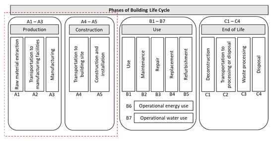 System boundary of a building’s life cycle stages. This study focused on A1–A5.