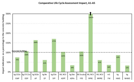 Table 5 and Table 6 present the actual impacts of the buildings and the differences between the timber and concrete buildings for each impact category. The concrete building was used as the baseline for comparison. Figure 2 illustrates the differences in percentage between the timber and concrete buildings using the concrete building as the baseline (i.e., 100%).