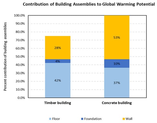 A contribution analysis was conducted using the GWP (kg CO2 eq.) to examine the impact of each building assembly and material. Overall, the GWP of the timber building was 25% lower than that of the concrete building (Table 7). In modules A1–A3, the floor component of the timber building had a 26% higher global warming impact than the concrete building, but its foundation and wall components had significantly lower GWP. This might be attributed to the lower requirement of materials in the timber building. For instance, the concrete and rebar requirements for the foundation were also lower for the timber building. The floor component was more material-intensive than other components in the timber building, which made it account for a higher percentage of impacts. Despite the longer transportation distance for CLT, the overall GWP in module A4 was 24% lower in the timber building because of a lower total material mass. All assemblies in the timber building showed lower GWP in module A5, which can be attributed to its lower mass that helped to reduce the fuel consumption in heavy machinery. Figure 3 provides the contribution to the total GWP of each building assembly (A1–A5). While the floor assembly was the largest GWP contributor in the timber building (i.e., 42%), the wall assembly contributed the highest global warming impact in the concrete building.