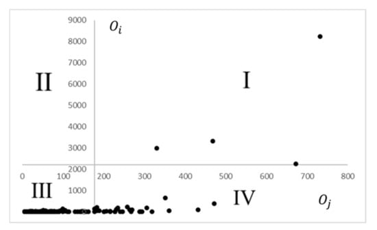 The equilibrium index is able to clearly reflect the city’s external diffusion or inward attraction, but it masks its absolute ability of external diffusion and inward attraction. Therefore, the k-value clustering method was utilized to cluster the two values of each city into high and low levels. The cities were then divided into four categories: high attraction–high radiation (I), high radiation–low attraction (II), low attraction–low radiation (III), and high attraction–low radiation (IV) (Figure 1). Beijing, Shenzhen, Hangzhou, and Shanghai are Class-I cities. This illustrates that these four cities are not only important diffusion centers, but also convergence centers, and the number of Class-II cities is 0. This is an indication that high radiation cities have strong attraction and do not have high radiation and low attractiveness. The proportion of Class-III cities is very high, with a total of 303. That is to say, most cities are at the edge of the network and are often embedded in the network through 1–2 branch subsidiaries. There are a total of 29 Class-IV cities, most of which are provincial capitals. Although their radiation capacity is limited, their ability to attract subsidiaries is stronger than that of ordinary cities, especially Chengdu, Wuhan, Nanjing, Xi’an, and other similar cities. This further proves that there is more competition between the core and the periphery, but core cities obviously have more advantages.