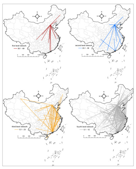 - The number of connections at different levels of the network: The number of connections between cities increases rapidly as the network level decreases. Among them, only 1.1% of the connections belong to the first-tier network, and 80% of the connections belong to the fifth-tier network. Most cities have a low connection intensity, and a few cities have concentrated high-intensity connections. The establishment of close links between core cities and extensive information exchange will lead to the Matthew effect of constant strength, which may render marginal cities locked, because they receive less heterogeneous information and gain less knowledge.