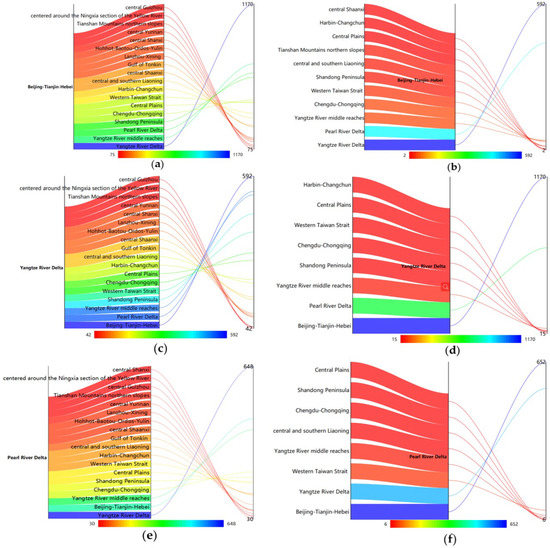 The external contact characteristics of the three urban agglomerations: (a) Beijing–Tianjin–Hebei urban agglomeration diffusion subenterprises; (b) Beijing–Tianjin–Hebei urban agglomeration attracts subenterprises; (c) Yangtze River Delta urban agglomeration diffusion subenterprises; (d) Yangtze River Delta attracts subenterprises; (e) Pearl River Delta urban agglomeration diffusion subenterprises; (f) Pearl River Delta attracts subenterprises.