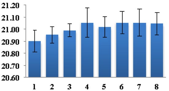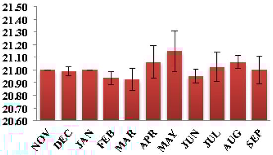 In terms of atmospheric oxygen concentrations, both the sampling points and the sampling period proved to be significant factors F (7, 80) = 4.2, p < 0.001, respectively, F (10, 77) = 4.37, p < 0.001. Significant differences were found between sampling point 1 (20.9% ± 0.09%) and points 4 (21.0% ± 0.12%), 6 (21.05% ± 0.09%), 7 (21.05% ± 0.11%) and 8 (21.05% ± 0.09%) (p < 0.01) (Figure 2). The highest concentration of atmospheric oxygen was recorded in May (21.15 ± 0.16%), with significant differences (p < 0.05) compared with November (21.00 ± 0.00%), December (20.99 ± 0.04%), January (21.00 ± 0.00%) and September (21.00 ± 0.11%) and very significant (p < 0.001) differences compared with February (20.94 ± 0.05%), March (20.93 ± 0.09%) and June (20.95 ± 0.05%) (Figure 3).