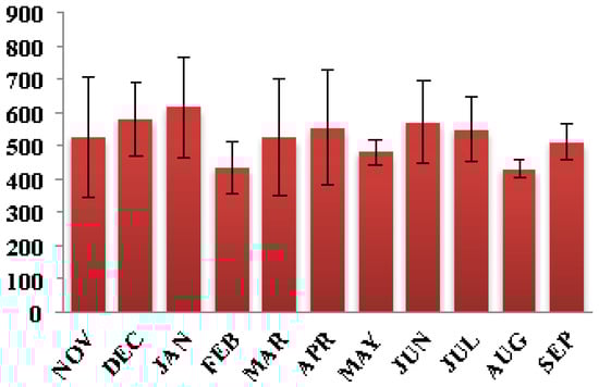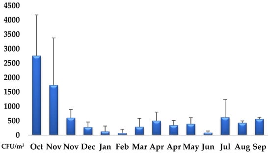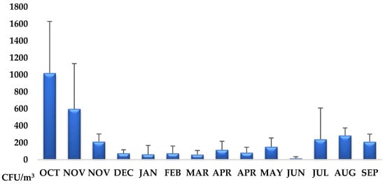 Instead, the sampling period proved to be a significant factor in the APCs dynamics H (13) = 58.24, p < 0.001. In October and early November, the values were very high compared with the rest of the study period. The lowest values were recorded in February and June. From October (2757 ± 1418 CFU/m3) to February (73 ± 134 CFU/m3), APC values decreased significantly (p < 0.01); in the following months, from March to May the values fluctuated without significant differences (p > 0.05), from 289 ± 297 CFU/m3 to 393 ± 215 CFU/m3. In June (84 ± 61 CFU/m3), there was an important decrease (p < 0.01) followed immediately by a significant enhance in July (620 ± 623 CFU/m3) (p < 0.05). In the following months, the values remained relatively constant (p > 0.05) (Figure 7).