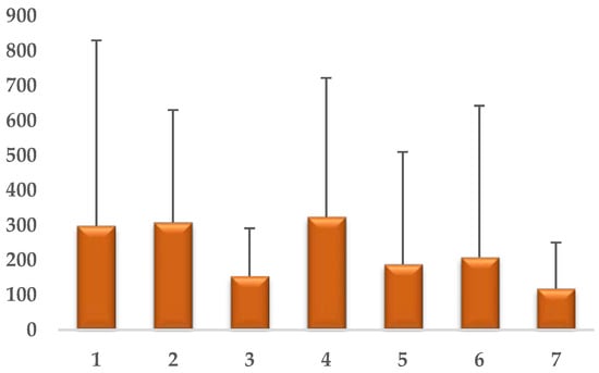 At the sampling points, the aerobic plate count (APC) ranged from 1184 ± 1565 CFU/m3 (sampling point 2) to 444 ± 419 CFU/m3 (sampling point 3), with no significant differences H (6) = 8.29, p > 0.05. The second highest value was recorded at sampling point 4 (646 ± 662 CFU/m3), followed very closely by 1 (639 ± 662 CFU/m3) and 6 (540 ± 985 CFU/m3) (Figure 6).