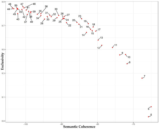 Due to the fact that STM is an unsupervised method, the number of topics included in the analysis is crucial [48,55]. As a result, we assess a variety of models covering a range of five to fifty topics. These models were then evaluated qualitatively for their capacity to produce coherent themes [55]. Additionally, the number of topics selected was determined by our understanding of the data set. Our study, which was required to analyze the number of themes, was also influenced by comparable previous research that employed topic modeling to extract meaning from massive text samples [55]. However, our objective was to use topic modeling to address the research questions, not advance the STM methodology.