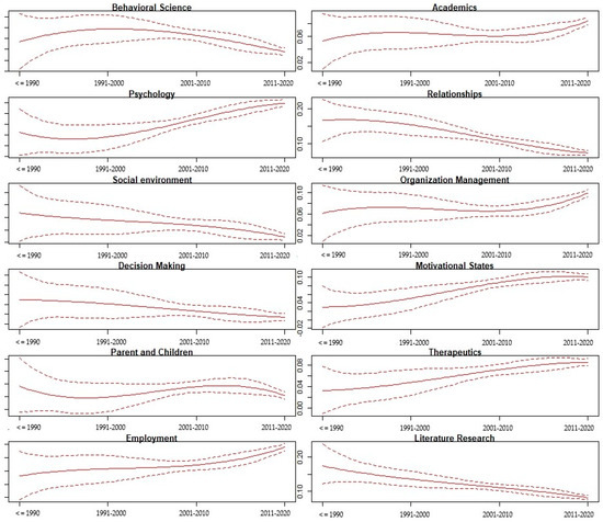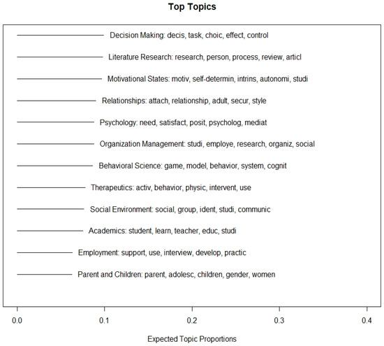 To further assess the significance of topics, we describe the twelve most prevalent topics, as measured by the percentage of papers dedicated to each. Figure 3 organizes the themes according to their highest probability words. For example, the “Decision Making” topic was discovered to be the most frequent research theme in the corpus. The following two most frequently discussed topics are “Literature Research” and “Motivational states”. Other themes in order of topic proportions are “Relationships”, “Psychology”, “Organization Management”, “Behavioral Science”, “Therapeutics”, “Social environment”, “Academics”, “Employment”, and “Parent and children”.