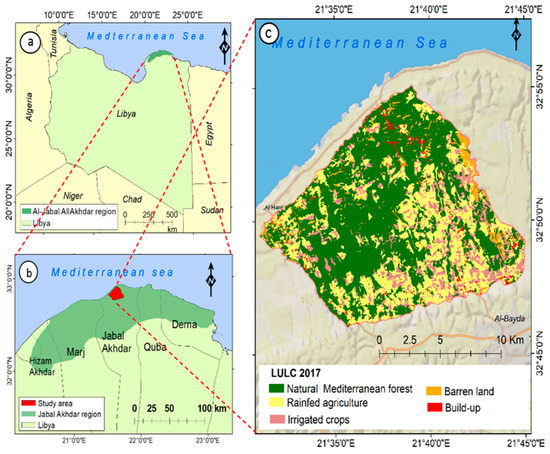 (a) Location of Al-Jabal Al-Akhdar region in Libya; (b) location of study area in Al-Jabal Al-Akhdar region; (c) land use/land cover (LULC) map of the study area of Lussaitah [8].