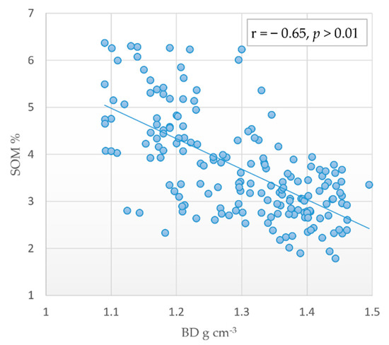 Higher BD in agricultural soils is due to machinery traffic during cultivation which led to soil compaction, one of the significant challenges in agricultural fields in several parts of the world [71,74,75]. Higher BD values in the cultivated land and lower values in natural forest land can be related to the level of soil organic matter. A strong negative correlation between BD and SOM was highlighted in previous works [76,77]. The BD of soils in this study was negatively correlated with the soil organic matter content (r = −0.65; p < 0.01), indicating the vital role of organic matter in improving soil structure and reducing bulk density (Figure 2). In addition, grazing pressure may be another reason for the occurrence of soil compaction in cultivated lands [78,79].
