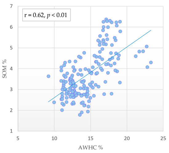 Although AWHC is one of the most important indicators of soil quality, it is dependent upon other soil properties, such as porosity, texture, bulk density, surface crusts, and organic matter [82]. Variations in AWHC among the different LULC types under comparison in this study could be associated with the difference in organic matter and clay contents of soils. It is well known that AWHC is positively correlated with SOM because organic matter raises soil field capacity above the permanent wilting point [83]. Our findings showed a significant positive relationship (r = 0.62; p < 0.01) between AWHC and SOM (Figure 3). With increasing clay content, soils require a higher organic matter content to maintain a given value of aggregate stability [84]. This may explain the decrease in AWHC following the conversion of forest land into farmland due to the increase in clay content accompanied with SOM reduction.