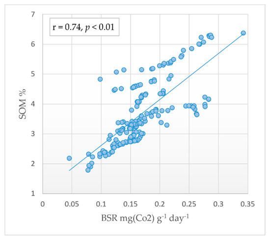 Results shown in Table 2 and Table 4 indicate that SOM is an important factor in determining the BSR rate in soils. Our findings show a strong positive correlation between SOM content and BSR rate (r = 0.74; p < 0.01) (Figure 5). These results are in agreement with that of Mallik and Hu [93], who showed a strong correlation between soil organic matter and microbial respiration during an incubation study. Agricultural management practices can either improve or reduce soil respiration. Leaving crop residues on the soil surface, adopting minimal tillage, using cover crops, or other practices that add organic matter will enhance soil quality and long-term soil respiration. Conversely, tillage practices that end up removing, burying, or burning crop residues result in minimizing organic matter content, which adversely affects the biological activity of soil, leading to reduced soil respiration over the long term [72]. In forest ecosystems, vegetation improves the rates of microbial respiration mainly due to increased organic matter through continual litterfall and root turnover and production of plant detritus, which feeds soil organisms [94].