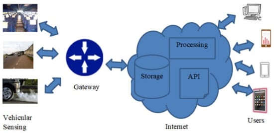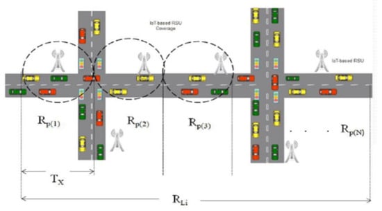 In recent years, there has been a steady growth in Internet of Things (IoT), a novel paradigm that is being materialized by integrating physical objects [,,]. The services the technology exhibits to numerous sectors like Smart city, Smart Agriculture, Smart Manufacturing, and others are understandable. For instance, Internet of battlefield things, Internet of medical things, Internet of animal things, and others have been introduced []. IoT-based smart city implementation needs a massive deployment of IoT devices, the associated big data and information requires cloud computing to handle storage and complexity computational issues. The intelligent data transmission algorithms based on data aggregation are very vital, this avoids bandwidth misuse in re-transmission of same data streams []. The role of IoT is to equip physical objects with sensing, computing, and communicating capabilities so that they can interact with each other over an established network and following the user defined rules []. In this work, we define the vehicular Internet of things (V-IoT) as a vehicular network where IoT devices, systems, and frameworks are deployed to monitor vehicular environments for numerous purposes such as road contexts, vehicle’s position, weather and environment monitoring, and so forth. The V-IoT may as well be defined as a form of vehicular network where communicating entities are mobile and/or stationary vehicles supplemented by the deployed IoT technologies, the paradigm has been realized from vehicular Ad Hoc Network that has been in existence for several decades and internet of things [,]. V-IoT has got a number of applications related to smart cty these include (i) road context-sensing, (ii) vehicle tracking, (iii) monitoring of intra-vehicular environments, traffic flow monitoring, etc. V-IoT is expected to ensure vehicular connections such as vehicle to road, vehicle to vehicle, vehicle to infrastructure, and possibly vehicle to everything (V2X) and improve the smart city applications soon after their deployment. Globally, IoT is considered as the major smart city enabler that facilitates the implementation numerous smart city applications [,,,].