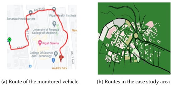 In the following Figure 2a, we demonstrate the route of the bus in which the experimentation was conducted. Two Lora compliant sensors were deployed in the bus to monitor the level of carbon dioxide and particulate matter 2.5. Table 1 shows the characteristics of the sensors utilized for the gateway testing. The route is chosen based on the position of the Lora gateway. Interestingly from the start to the destination of the chosen route, the sensors on-board are connected to the gateway. Apart from the two key pollutants being monitored, both sensors have got weather and signal status monitoring capacities. The two LoRa compliant sensors have been employed to monitor the saturation of the monitored parameters from the target environments. The sensors were deployed in the bus whose travel routes fall into the coverage of the gateway. Real-time information is retrieved through an intuitive web-based dashboard. The bus route is extracted from the case study area Figure 2b. The map of main roads is extracted from openStreet Map to observe how many roads are present and how many of our devices could be deployed for the entire area coverage. We have employed the simulation of urban mobility (SUMO)-simulator to model the macroscopic roads from the case study area. The simulator helps us to understand the nature of the target area regarding the signal interference. All urban fixtures are observed and the geographical locations estimated; these include roads, water-ways, buildings, and other urban features. From the case-study area, roads are represented by the edges of the map, whereas the buildings are represented by polygons, nodes represent the road intersections. Even-though the case study area encompasses a mixture of main and residential routes that connect residential areas to the main roads, our target will be monitoring the main roads that experience heavy traffic volumes on a daily basis. Main routes are indicated by the major edges from the case study area map.