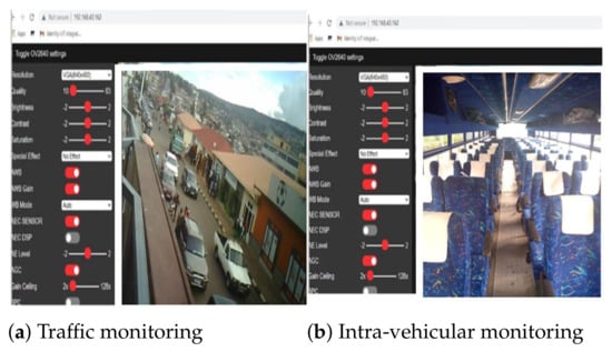 An ESP-32 camera module that supports image and video upload is employed to monitor road conditions. The camera module is embedded in ESP32, a low-cost low-power system on chip micro-controller unit with integrated Wi-Fi and dual-mode Bluetooth. Heavy traffic flow routes, road maintenance activities and other road situation contextual information would be detected and presented to drivers and traffic monitoring officials for quick decisions on whether to use or avoid a particular road. Additionally, the developed system can be used to monitor the internal environments of vehicles, especially public buses for seats availability, safety, and other intra-buses conditions. In this section, we show the testing of the developed IoT prototypes mainly for vehicular applications. In Figure 4a we show the monitoring of urban roads from the case-study area. We use the prototype to stream the condition of one of the roads in the case-study area. The device was deployed at a height of 5M from the ground to monitor a reasonable length of the road. Road conditions could be monitored and transmitted in real-time.