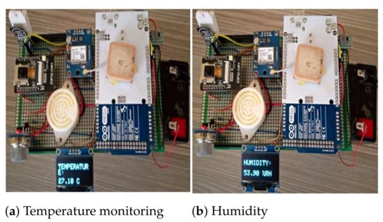 DHT22 sensor is used to monitor the road environment temperature and humidity. The sensor comprises of two parts, a capacitive humidity sensor and a thermistor. The sensor is also equipped with a built-in chip that converts analog to digital. This gives out digital signal with temperature and humidity values which are compatible with any micro-controller. Figure 5a,b demonstrate the temperature and humidity monitoring using the prototype