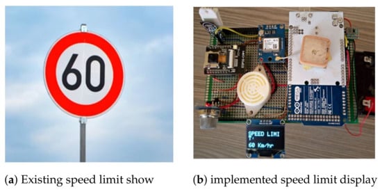 Our roadside unit has road name presentation application, which includes the road, street, and avenue details that are displayed to the users. Novice drivers and city visitors will get the mentioned details for help during the driving duration. Our system compliments any existing system that may be available by presenting the city-district-route number information to the road users. OLED-based display is used to implement the receiver and display of the device to show road description, speed limit, weather parameters. Figure 6a,b show the existing and implemented road-name display.