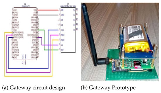 In this subsection we present an IoT-based network layer gateway prototype for numerous vehicular IoT applications. From the protocols discussed above, and available resources we have built a LoRa gateway using a raspberry Pi and a LoRa radio transceiver. Figure 9a,b below show a circuit design and prototype of the LoRa gateway respectively. The developed gateway is based on three important components, the radio transceiver with its expansion board, the control unit and the power supply. RFM9x LoRa radio module is used; the module operates at 868 or 915 MHz frequency band amateur Industrial scientific, and medical license-free frequency bands. It supports 20 dBm LoRa radio packets, with directional antennas, the radio module could go up to 20 Km. The expansion board is constructed using a printed circuit board that interfaces the module with a raspberry Pi control unit. Another Important component of this system is its control unit that is constructed using a raspberry Pi. This is a small sized single-board computer. The raspberry Pi control unit is equipped with wireless local area network (LAN). Like other computers it has an Ethernet port as well that makes it suitable for LAN. The last but not least s the raspberry Pi power supply that comprises of the raspberry Pi power board with a rechargeable battery.