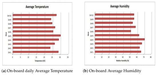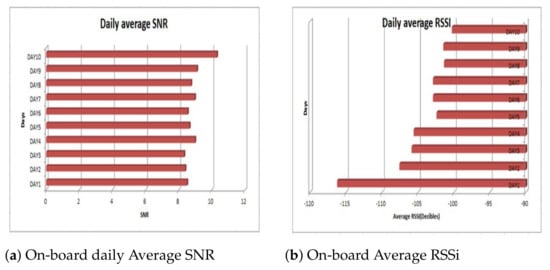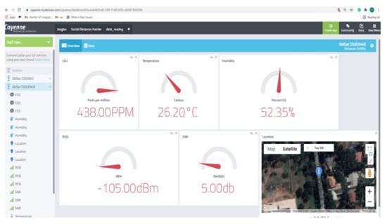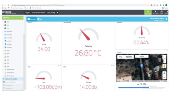 One of the important services of smart city is monitoring and control of air pollution. Public buses are one of the places that gather several people at a time. It is worthwhile very crucial to monitor the level of key pollutants in public buses that have passengers on-board. Figure 11a demonstrates the daily average carbon-dioxide monitored in one of the buses from the route in the case study area. From the observation, the saturation of this pollutant increases with the number of passengers on-board. Figure 11b depicts the daily average saturation of PM2.45 in the same entity. The two pollutants have been found to rise with the increased temperature. The Lora sensors employed in this study are equipped with weather measurement capacities. Temperature and humidity were measured along with the pollution saturation Figure 12a,b. Furthermore, Good communication signal is vital for data transmission in smart city services. It is therefore of great importance to keep a sharp eye on the signal status. Our system learns the communication signal status in terms of received signal strength indicator and signal to noise ratio Figure 13a,b. While the above descriptions present the historical data analyses Figure 14 and Figure 15 demonstrates the real-time data visualization through an intuitive web-based dashboard.