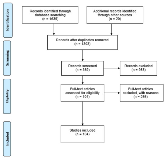 For the selection of articles for this review, we followed a systematic approach as described by Shamseer et al. [28], called the Preferred Reporting Items for Systematic Reviews and Meta-Analyses (PRISMA). To find relevant articles, we used keywords and terminologies such as economic and industrial relevance, high-value medicinal plants, ethnomedicine, folk-paediatric, paediatric, childhood diseases, indigenous medicine, and phytomedicine. The bibliographies from the retrieved papers were also checked and saved using Endnote reference manager. Plants were selected in this research based on their traditional use in the treatment of multiple childhood diseases. The plants were selected for their health and economic potential with respect to childhood diseases. The six medicinal plants were selected based on their high frequency of citations in the literature and high number of uses for managing three to six childhood diseases. Search engines such as Web of Science, Science Direct, Google Scholar, PubMed, Scopus and JSTOR were accessed for relevant studies. Screening of the published literature was guided by the scope predefined for the current study. Aside from the peer-reviewed journals, theses and dissertations, books were obtained from the libraries of North-West University (NWU) and the University of Mpumalanga (UMP), South Africa. A total of 1635 articles were obtained based on the keywords used for the search. Additional data were collected from 20 sources located at NWU and UMP libraries (Figure 1). Following the removal of duplicates, the remaining 1303 were screened with respect to the eligibility criteria and articles related to ethnoveterinary, wild food and those more than 15 years old were excluded from the selection because they did not meet the criteria and the scope of the study. We accessed the full texts of the resultant 369 publications. The research papers (systematic or literature) exclusively dealing with current childhood diseases were retained. Thereafter, 266 articles were removed due to the lack of sufficient information regarding the scope of this review, while 104 articles were included to complete this study.
