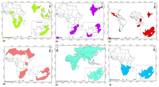 Figure 2. Distribution map of the selected medicinal plants: (a) Acalypha glabrata, (b) Aloe maculata, (c) Datura stramonium, (d) Gomphocarpus fruticosus, (e) Rhoicissus tridentata and (f) Vachellia karroo.