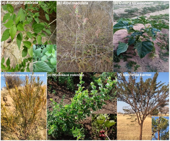 Figure 3. Six South African plants widely used for managing childhood diseases (a) Acalypha glabrata (b) Aloe maculata, (c) Datura stramonium, (d) Gomphocarpus fruticosus, (e) Rhoicissus tridentata, (f) Vachellia karroo.