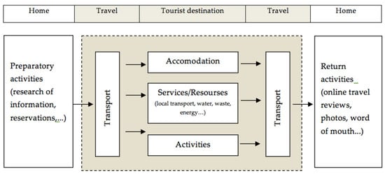 To analyze tourism according to the logic of LCA, it is necessary to identify what is meant by a tourism product. It is not a simple product, but a wide range of goods and services that interact with each other to collectively create a tourism experience with tangible aspects (e.g., hotel, restaurant, and airline) and intangible aspects (e.g., sunset, landscape, and atmosphere) [84]. Middleton (1989) notes that the term “tourism product” is used at two different levels: the “specific” level (i.e., a unique product offered by a single company, such as a sightseeing tour or airline seat) and the “total” level (i.e., a tourist’s complete experience from the time they decide to leave home to the time they return) [85,86]. This paper considers the tourism product at the “total” level by assessing the environmental impacts of a vacation. The tourism product analyzed includes several possible alternatives depending on the means of transport used to reach the chosen destination, the type of accommodation, the activities carried out during the vacation and the services and/or resources used (water, waste, energy, transportation, etc.) (Figure 1).