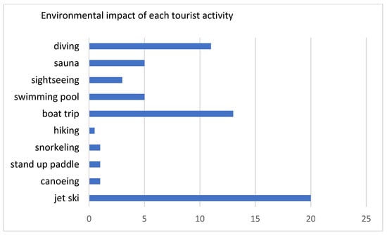However, the negative environmental effects do not derive only from the type of transport or of accommodation but also from the activities carried out by tourists during their journey. The greatest impacts are related to activities that consume fuel or electricity and much depends on the number of people who can perform the same activity at the same time (the higher the number of people, the lower is the impact). According to the LCA the jet skiing is the activity carried out in the Cinque Terre that produces the most negative effects on the environment while hiking is the most sustainable. The second least impactful activity is the sightseeing between one village and another moving by train, while the penultimate activity in terms of impacts is the boat tour. The sea activities to be considered sustainable are snorkeling, canoeing, and stand-up paddle. The graph below (Figure 5) reports the environmental impacts of the land and marine activities considered using a reference scale of 1 to 20, where 1 is the minimum impact and 20 the maximum impact. Taking into account the results obtained, local administrations should promote less impactful activities more, e.g., by better signposting the park’s hiking network and by trying to convert more impactful marine activities such as jet ski to other activities such as snorkeling or canoeing. Certainly, local sustainable development tourism plans should prevent private companies starting new high impact activities inside the park area.