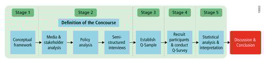 This research followed a 5-stage Q-methodology process adapted from Webler et al. (2009) (see Figure 1) []. First, we establish the conceptual framework which provides us with the conceptual lens with which to better understand and analyze the diverse discourses surrounding the transition to a sustainable circular plastics economy in the Netherlands. Second, we define the concourse on the topic, which means mapping the wide variety of stakeholder perspectives and viewpoints on the study object []. This is done through a mix of media and stakeholder analysis, policy analysis and semi-structured interviews. A set of representative statements on the topic, called the Q-sample, are then derived from the concourse [] (stage 3). In a fourth stage, respondents (the Participant set or P-set) are asked to answer a survey where they rank the chosen set of statements (Q-sample) based on individual viewpoint and preference. This process is called ‘Q-sorting’ and it is a key part of the Q-methodology as this is how the participant’s underlying discursive position on the studied topic is revealed []. The Q-sorting process is followed by a factor-analysis that evidences groups of respondents which sorted the set of statements (Q-sample) similarly (stage 5). These groups of similar responses are combined into ‘factors’, which reflect a district discourse on the studied topic.