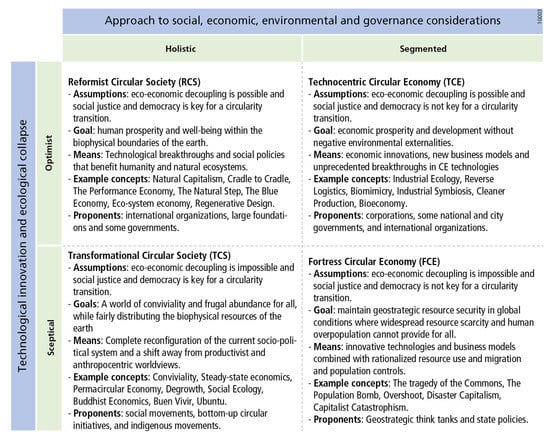 Reformist Circular Society (optimist and holistic) discourses seek to create a sustainable circular future through a combination of innovative business models, social policies and technological breakthroughs (such as Cradle to Cradle [], the Blue Economy [] and Natural Capitalism []).