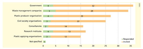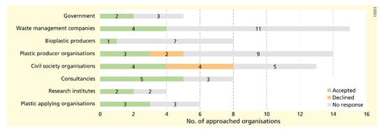 Semi-structured interviews with professionals in the Dutch plastics sector were held to explore their perspectives on the transition to a sustainable circular plastics economy in the Netherlands. Interviewees were derived from the results of the stakeholder analysis as well as through ‘snowball-sampling’ []. The general objectives of the interviews were to identify stakeholder opinions regarding the transition towards a sustainable CE for plastics in the Netherlands, including their perspective on current public policies, business practices, technologies, environmental issues, and social implications (see Supplementary Materials C with full interview questions). Interviews were conducted online between March and April 2020. In total, 74 organizations were approached for an interview of which 24 accepted the interview request (35.4% response-rate). To ensure diversity and plurality of views and perspectives, interviews were sought with actors from all 7 stakeholder groups (see Figure 4 and Supplementary Materials D for further information on each interviewee).