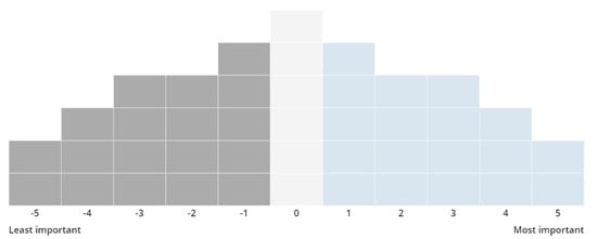 During the Q-survey, participants were asked to rank all the 42 statements (Q-sample) following this leading question: “How important do you consider the following action statements in the transition to a sustainable circular plastics economy in the Netherlands?” To do so, participants had to place the statements on an 11-point quasi-normal distribution ranging from “least important (−5)” to “neutral (0)” to “most important (+5)” (see Figure 6). The nature of the quasi-normal distribution pyramid forced participants to make important trade-offs between statements they considered similarly important or unimportant and, in doing so, participants revealed their underlying opinions and points of view on the topic. Each participant’s final set of submitted ranked statements constitutes his or her “Q-sort” (the full Q-survey process and instructions can be seen in Supplementary Materials E).