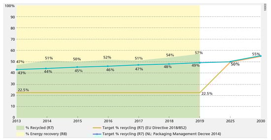 Three key policies regulate plastic waste within the Netherlands, the “National Waste Plan” established in 2003, as well as the “Packaging and Paper and Cardboard Management Decree” and the “Framework Agreement on Packaging and Litter”, which were both established in 2007. These policies set minimum plastic packaging recycling targets which rose from 32% in 2009 to 38% in 2010, and further to 42% in 2012. They also created a deposit system for large PET bottles and established the Dutch EPR system for packaging waste. These policies were updated in 2014 to increase the minimum recycling targets from 43% in 2013 to 52% in 2022 (with an increase of 1% per year).