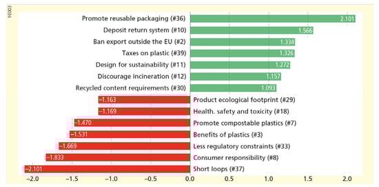 The results of the factor analysis were carefully examined and interpreted by contrasting the perspective of each factor group with the typology of circularity discourses developed by Calisto Friant et al. (2020) []. This allowed the mapping of the different factor positions in the wider literature on the transition to a circular economy and society.