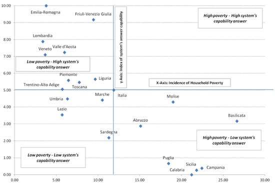 Italian regions according to the combination of incidence of household poverty and index of system’s answer capability: Index of system’s answer capability ranging from 0 = lowest capability to 10 = highest capability.