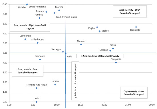 Italian regions according to the combination of incidence of household poverty and index of household support: Index of household support ranging from 0 = lowest support to 10 = highest support.