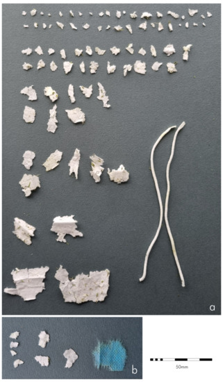 The bagged lawn clippings were airdried, sorted on a dark-colored metal tray (to make the pieces of white and light blue fabric stand out) and all macroscopically visible pieces of the mask were extracted with laboratory tweezers. No attempt was made to screen the clippings under high magnification to extract microfibers. The pieces were then classified, sorted by size (Figure 4 and Figure 5, Figures S19–S24)) and tabulated (Table 1).