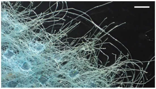 Detail of fibers of spunbond fabric. Experiment B. The white bar indicates 1 mm.