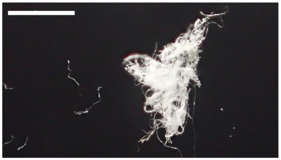 Detail of shredded melt-blown fabric. Experiment C. The white bar indicates 1 mm.